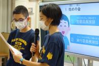 その後は、中学部の生徒会長の紹介と任命式を行いました。今年度の生徒会長は中学部3年生のSさんとGさんの2名に決まりました。一人では自信がないので、「二人一緒なら…」ということで引き受けてくれました。一人では難しいけれど、友達と一緒なら「私にもできそう!」と思えて、前向きに取り組もうとする姿にも、また一つ成長を感じました。