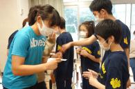 今回は3つの活動を通して交流をしました。最初に『名刺交換ゲーム』を行い、名前や好きなことや得意なことについて、名刺を交換しながら挨拶をしました。他附属の生徒たちの様子からも、コミュニケーションをとるために、筆談やアプリを活用しながら、自分のことを相手に伝えようと試みている姿が見られました。大塚の生徒たちも恥ずかしそうにしつつも名前や好きなことを伝えて、交換した名刺を嬉しそうに見せてくれました。