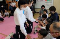 次に『風船バレー』を行いました。グループに分かれて、椅子に座って円になり風船を打ち合いました。風船には鈴を入れて、ワンバウンドOKのルールが設けられていました。大塚の生徒たちも各グループに分かれて一緒に楽しむことができていました。