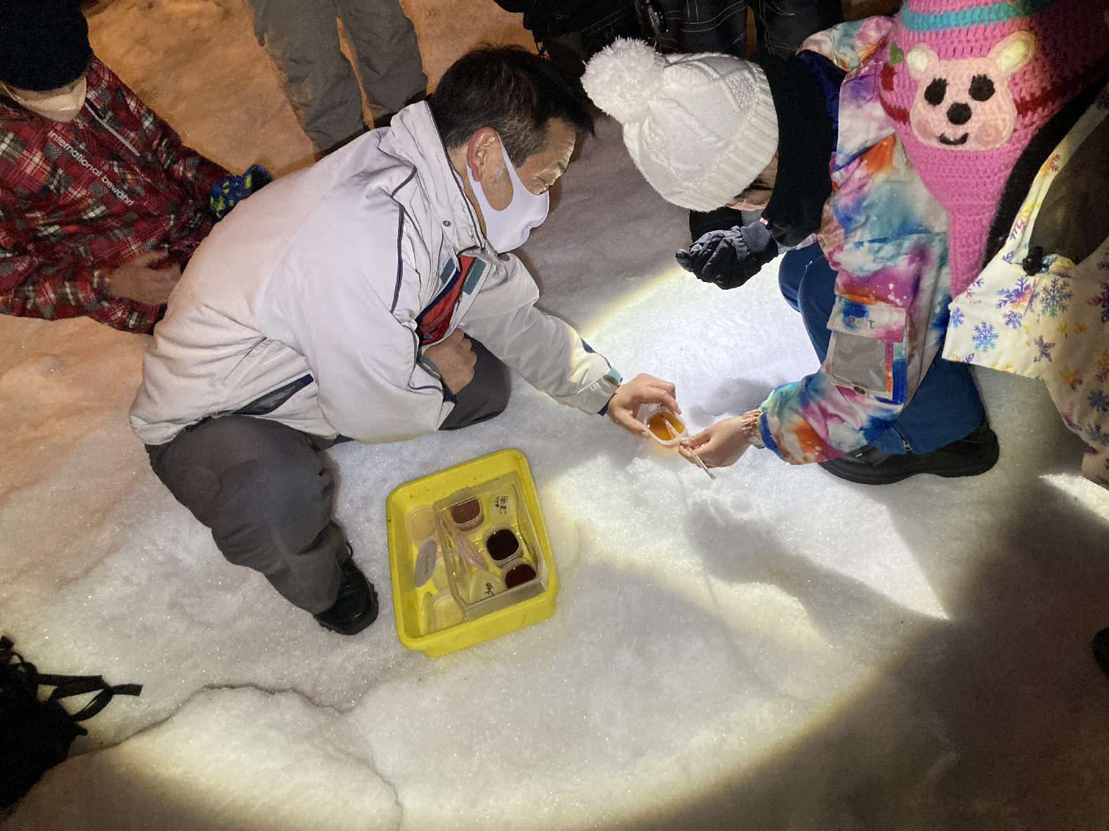 1/19(木)に、2年生のみんなで、宿泊場所の岩鞍ハウスの軒先で色々な液体の状態変化について調べました。