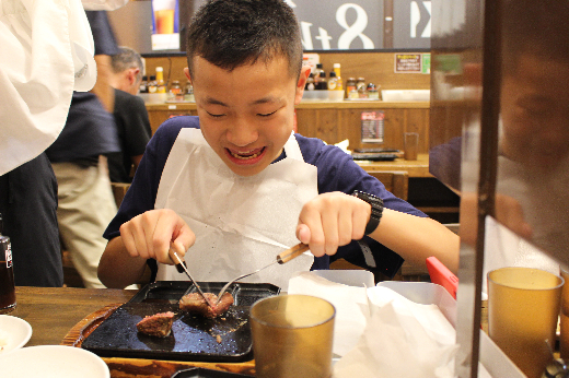 夕食は、みんなが楽しみにしていたステーキ屋さんへ行きました。ホテルからお店へは、社会科の学習と関連付けて、簡略化した地図を手掛かりにして生徒たちに案内してもらいました。お目当てのステーキを食べて、大満足で修学旅行の1日目を終えました。