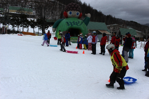 18日は、宿舎に到着して開校式や昼食を済ませてから、早速、ウエアに着替えて雪上活動を行いました。ソリゲレンデでそり遊びをしたり、雪玉作りゲームやそり運びレース等をしたりして楽しみました。そり遊びでは、何回も滑るうちにコツをつかんで、まっすぐ長い距離を気持ちよさそうに滑り下りる姿が見られました。