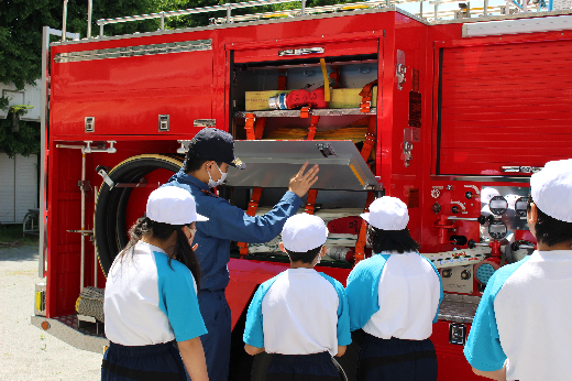 「火(火災)は、どのくらい熱いですか?」「消防士さんは、いつも何を食べていますか?」「煙(火災時)のにおいは、どのようなにおいですか?」「消火器のケースの色が違うのはどうしてですか?」「火災が起きた時に何人位が現場に行きますか?」「どうして早く(火災現場に)到着できるのですか?」等々、グループ毎に消防士の皆さんへ質問をしました。生徒たちの質問に対して、消防士の皆さんが、一つ一つ分かりやすく教えてくれたり、消防署内の案内をして下さったりしました。