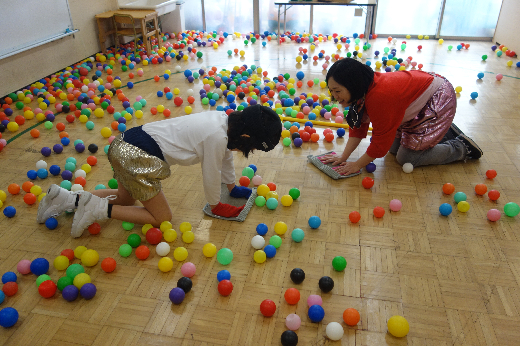 豆まきは、豆の代わりにたくさんのカラフルボールが登場です。お部屋中にまいて、足で動かしたり、道具でかき集めたり、雑巾がけの姿勢でボールを追いかけたりしました。鬼の的めがけて投げたりボックスに入れたりして、最後のお片付けも楽しみました。先生たちも「鬼は外~!」とたくさん投げましたよ。