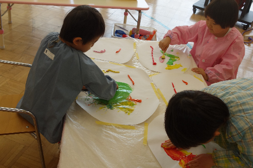 絵の具をつかってみんなで大きなこいのぼりをつくりました。すてきな模様のこいのぼりになりました。