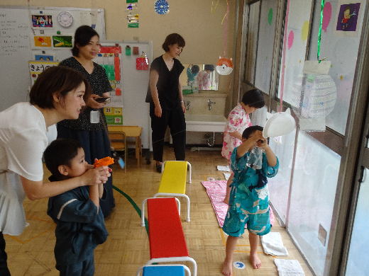 水でっぽうのコーナーを作りました。今日の夏祭りはこれまで楽しんできたことをお家の人と一緒に楽しむ会です。さかなすくいの道具の使い方も上手になってきていたり、水でっぽうを上手に的に当てられるようになっていたりして、これまでよりも楽しめていたお友だちでした。
