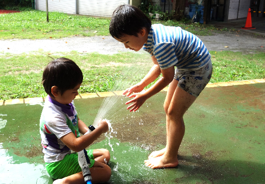 6月に入り、雨の日が続きますね。雨の日は遊具では遊べないけれど、雨で遊ぼう、とレインコートを着て外に出ました。たまった雨水で遊んだり、水たまりに入って足や手でダイナミックに水遊びをしたりしました。
