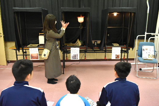 その後は、学年ごと『電話』、『アイロン・ミシン』、『あかり』の3つのグループに分かれて体験しました。『電話』の体験では、黒電話やプッシュホンのかけ方を教わり、実際にダイヤルやボタンを操作して、生徒同士で電話をかけ合って会話をやり取りしました。『アイロン・ミシン』の体験では、火のしから炭火アイロン、電気アイロンへの移り変わりや、手回し式ミシンから現代のミシンへの移り変わりについて教わり、実際に手に持って重さを感じてみたり、操作したりしてみました。アイロンとミシンは、作業学習などで使用している道具と見比べて違いを見つけました。『あかり』の体験では、行灯から石油ランプ、電灯への移り変わりについて、部屋を暗くして当時の明るさを体験しました。