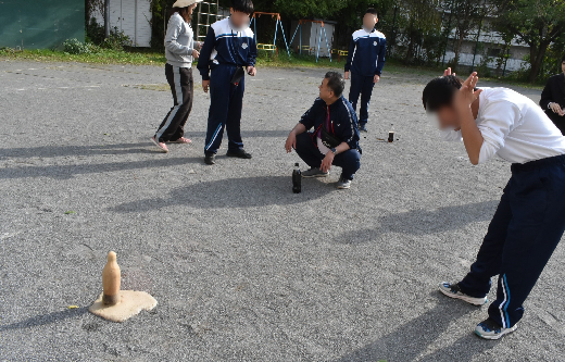 火山の噴火の仕組みや地層のでき方等、難しい内容についても、生徒たちの興味関心をひく実験を取り入れながら丁寧に説明をしてくださいました。火山の噴火の様子を再現した実験では、羽田先生の説明を聞いてから、すぐに嬉々として取り組む生徒や、なかなか実験に踏み切れずに恐る恐る遠目から眺める生徒等、それぞれ火山の噴火に見立てたコーラが噴き出す様子を興味深く見ていました。次に、火山灰の振り方を再現した実験に取り組み、粉をマグマに見立ててボコボコと下から吹き上がる様子を体験的に実験しました。