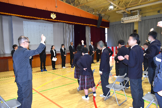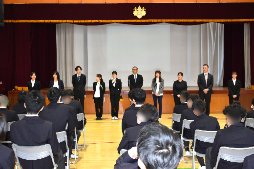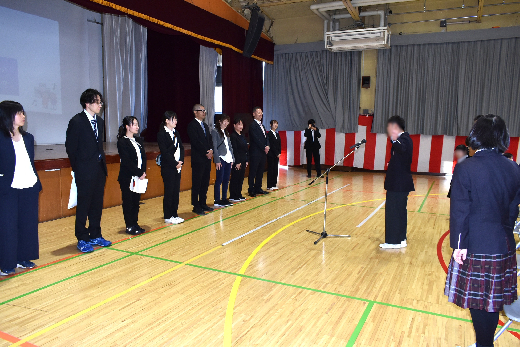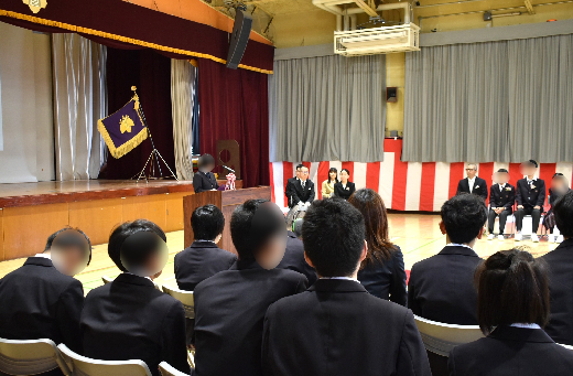 次に新年度の各クラスの紹介がありました。クラスごとに前に出て、担任の先生の紹介に続いて、高等部の生徒たちも一人ずつマイクを回しながら自己紹介をしていきました。みんなの前に出ての自己紹介では、恥ずかしそうにしている生徒、緊張して早口になりながらも一生懸命伝えようとする生徒、一つずつ学年が上がり先輩としての意気込みが感じられる生徒など、様々な表情が見られました。